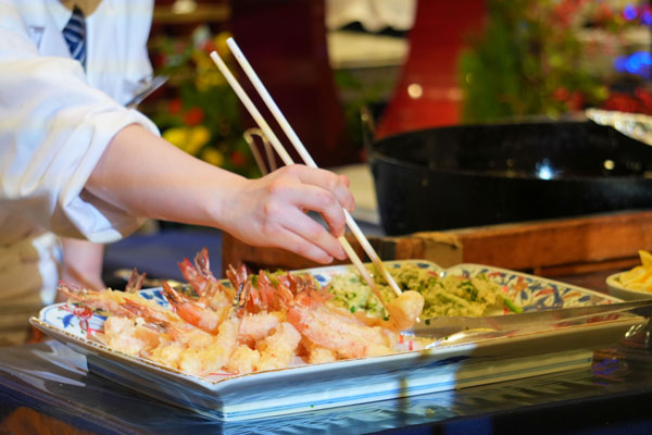 など、お客様の目の前で仕上げるライブキッチンメニューやお子さまにも人気の和洋中様々なお料理をご用意しております。