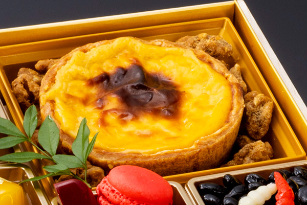 二段重ねの重箱には、パティシエが一品一品仕上げた洋菓子のほか、かまぼこに見立てた紅白のマカロンなど新年の団らんを華やかに演出するスイーツも並びます。おせち料理の後のデザートとしてお楽しみください。