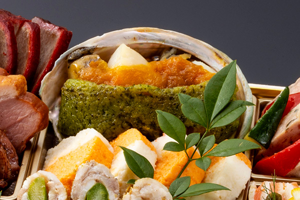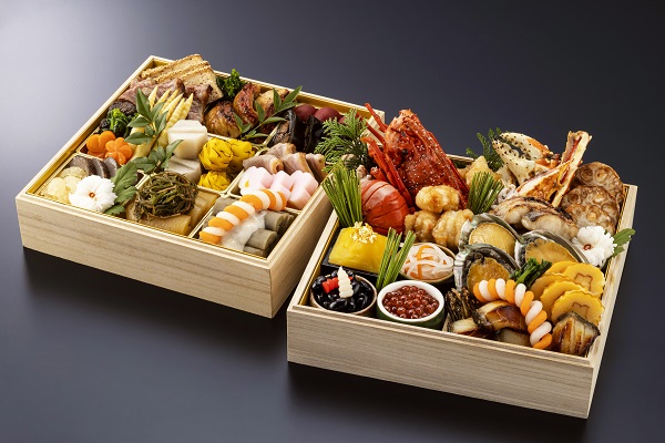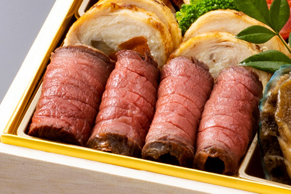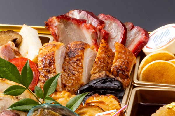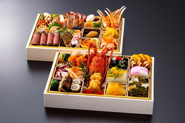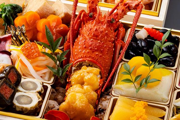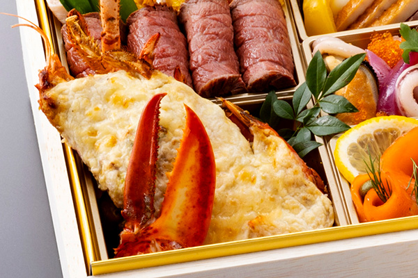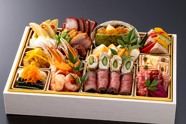 海胆風味に仕立て贅沢に一尾丸ごと盛り付けた伊勢海老艶煮、柔らかい肉質と芳醇な香りが特徴のブランド牛いわて牛五ツ星のローストビーフ、自家製甘味噌で味わう鴨肉の北京式焼き物など、多彩な味わいを心ゆくまで楽しめます。紅白蒲鉾や数の子、田作りなど、おせちの定番品目の他、フォアグラやキャビアなどの豪華珍味も取り入れたハレの日に合う上品なおせちです。