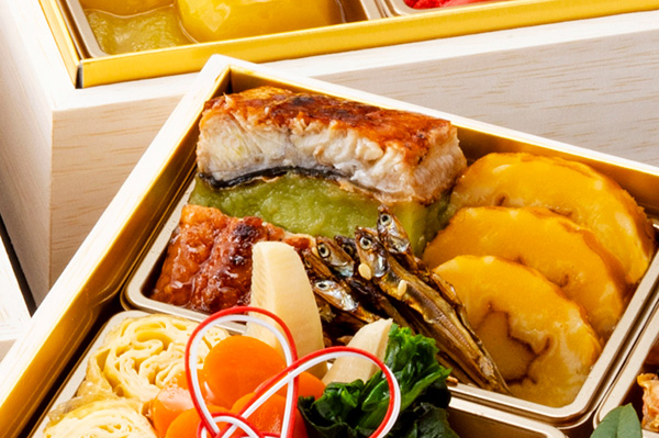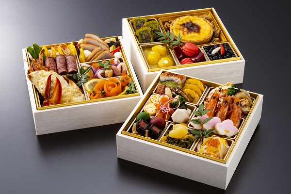 伝統的な日本料理の品目に、鮮やかな鰻若草博多や柔らかく蒸した鮑の旨みを際立てる菜種焼きなど、食べやすさと美しさを追求した和の重。ハーブの香りと肉本来の旨みが味わえる紅木豚のハーブローストポーク、特製ドレッシングで旨みと食感が楽しめる魚介類のマリネなど華やかな洋の重。フランスの伝統菓子ガレット・デ・ロワや縁起物の黒豆を和風にアレンジしたデザート重まで趣向を凝らした充実の3段おせちです。