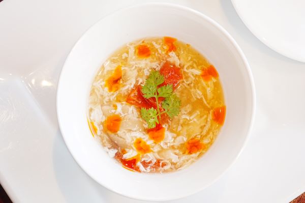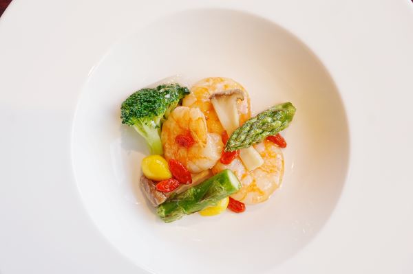 卵白のみを使用しドライトマトと飾りのセルフィーユでクリスマスカラーに仕上げたドライトマトの白い酸辣湯は、程よい酸味と自家製辣油の辛みが調和されたまろやかな味わいの一品。その他にも海老料理や低温調理された鴨肉を包んだ四川ダックの中華クレープ巻き、デザートプレートまで楽しめる、ランチタイムの忘年会やゆったり過ごす一年のご褒美ランチにもおすすめです。
