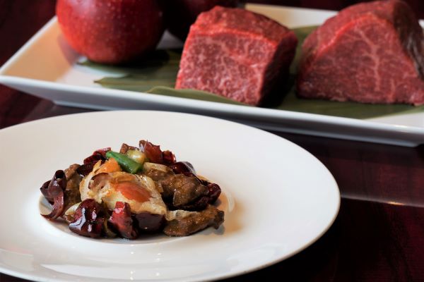 県産牛モモ肉と林檎の柱候醤(チューホージャン)炒めは、軽く火入れをしたリンゴと県産牛モモ肉を大豆が生み出す豊かなコクとまろやかな香りで炒め旨味を引き出した一品。リンゴの食感と酸味、甘みのある調味料で味わいに厚みを持たせました。