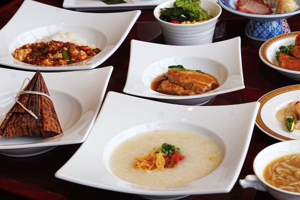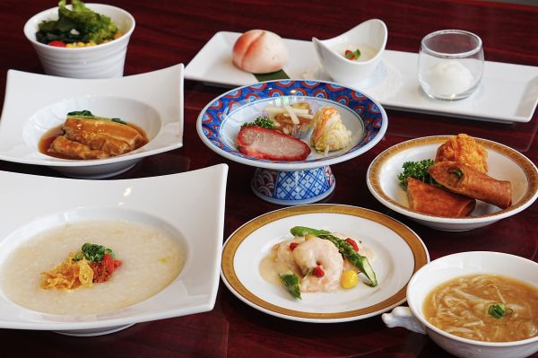 海老料理や杜仲茶ポークの煮込み、春巻きなどのほか、食事は中華粥または中華ちまき、麻婆飯のいずれかお好みのものをお選びいただけます。そのほかにも、フカヒレスープやデザートプレートも付きます。