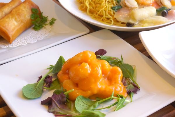 <海老のチリソース煮、海老のオーロラソース、烏賊と北寄貝の塩味炒め、青菜の塩味炒め、麻婆豆腐、