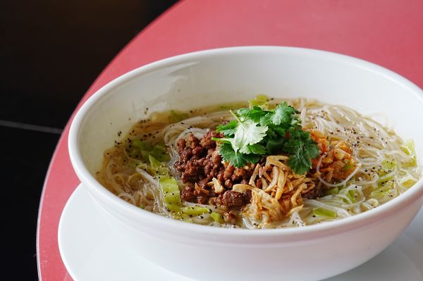 台湾産ビーフンをあっさり塩味に仕上げ、豚ひき肉をスパイシーな五香粉で炒めたそぼろのほか、干し海老、搾菜、揚げ葱、香菜と共に。