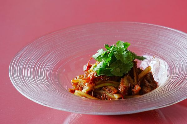 滷水で煮た牛ハチノスをセロリ、長葱、香菜と麻辣ソースで和えたピリ辛な一品。