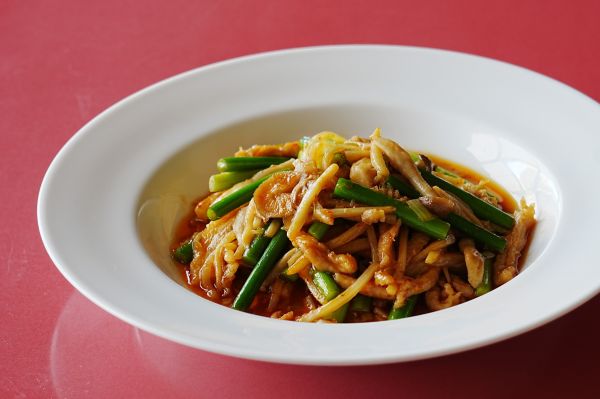 豚肉と大蒜の芽や筍、シメジなどを干しエビ香る沙茶醤ベースの醤油味で炒め旨味と辛味を楽しめる一品。