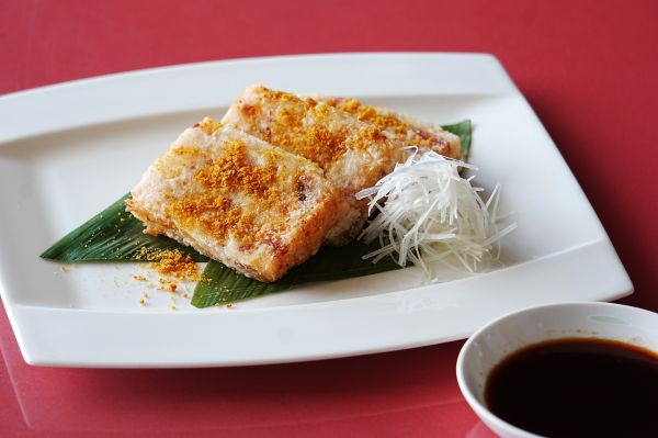 大根、搾菜、台湾腸詰、上新粉などで作った大根餅の表面に贅沢にからすみを纏わせ、台湾産の金蘭醬油をベースにした香り高いソースと共に。