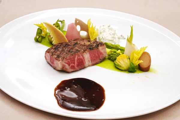 〇香り高くマリネした早池峰三元豚肩ロース肉のグリルと岩泉ヨーグルトのコンディマン