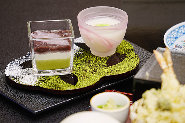 鮪と白身の造里をお内裏様とお雛様に、うるい酢味噌かけと菜花辛子和えの小鉢をぼんぼりに。菱餅に見立てた甘味は、マスカルポーネと小倉、抹茶プリン。さるなしジュースを使った甘酒とご一緒にどうぞ。目にも華やかな特別御膳で、季節の趣をご堪能ください。