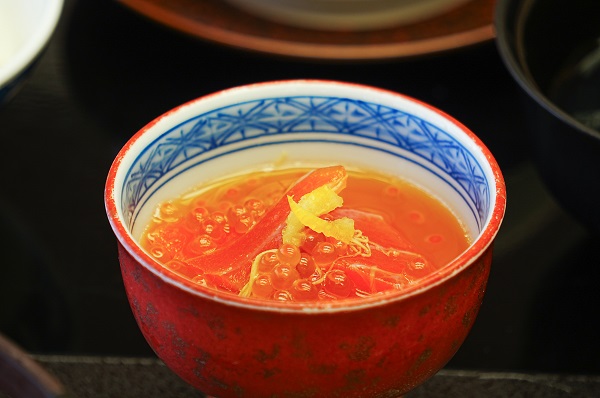 先付は盛岡サーモンの紅葉漬け。鮮やかに色づいた紅葉を感じさせる盛岡サーモンを鱒イクラと合わせ、仕上げに柚子を添えて爽やかに。