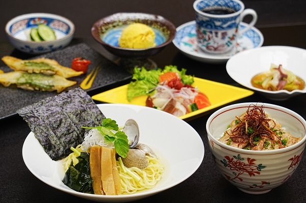 今月のメインは浅利の塩ラーメン。日本料理対い鶴の「料理長こだわりの出汁」と熊さん株式会社の「本仕込みスープ塩味」の融合をお楽しみください。ラーメンに合わせて塩味で仕上げた豚バラ丼も合わせてどうぞ。