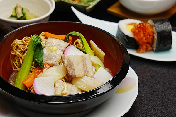 今月のメインは揚げ蕎麦の玉子餡かけ。県産の蕎麦粉と小麦を使用した麺を香ばしく素揚げした一品です。揚げ蕎麦のサクサクとした食感と、豚バラや白菜を合わせた具沢山の餡をお愉しみください。サーモンとアボカドの太巻きも食べて、福を呼び込みましょう。