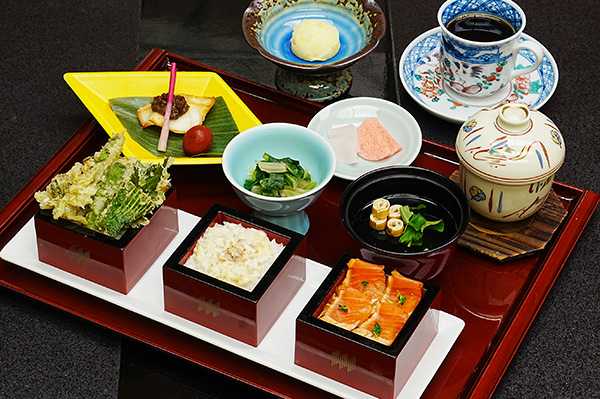 ズッキーニや山菜を使った天丼は、走りの山菜の程よい苦みと継ぎ足しで深みを重ねた自家製丼タレが調和する、ご飯が進む一杯に仕上げました。