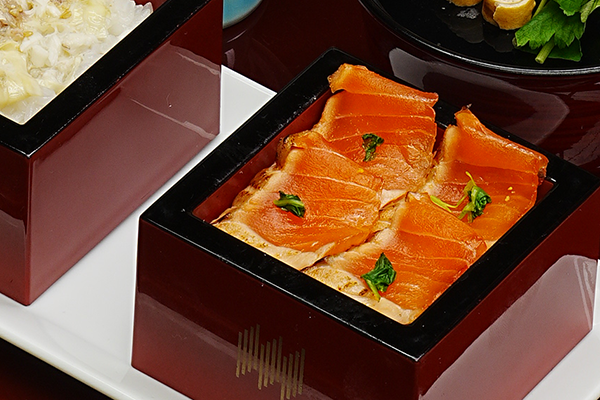 宮古サーモンは脂ののった身を炙りで香ばしく。湯葉餡かけは白身魚のほぐし身と湯葉の優しい味わいをお楽しみください。
