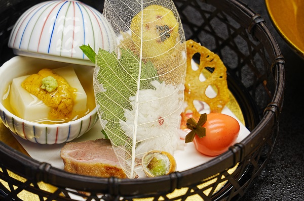 前 菜 胡麻豆富海胆のせ 柿玉子 蓮根煎餅 焼き栗 塩煎り銀杏 県産菊花蕪 アマタケ合鴨幽庵焼き