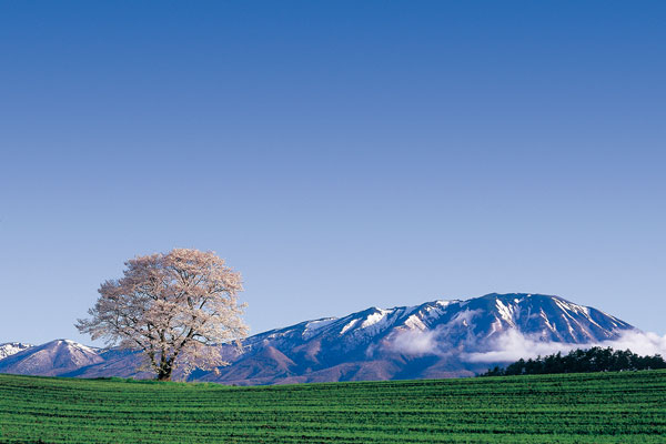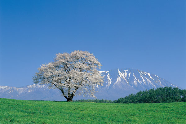 秀峰岩手山を背景に小岩井農場の緑の大地に根を張る一本桜(エドヒガン)と上丸牛舎入口に続く90本の桜並木が見ごろの小岩井農場を訪ねるタクシー送迎付宿泊プラン。